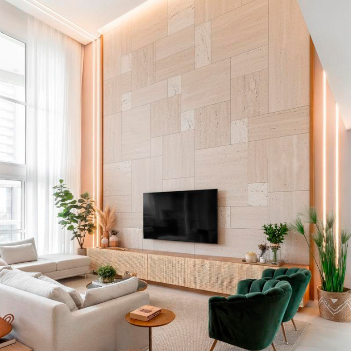 Travertino Palazzo — revestimento exclusivo em paginação nobre com tons elegantes e movimento natural. Indicado para revestimento de paredes e painéis de destaque, entrega sofisticação imediata e acabamento de alto padrão com efeito de obra pronta.